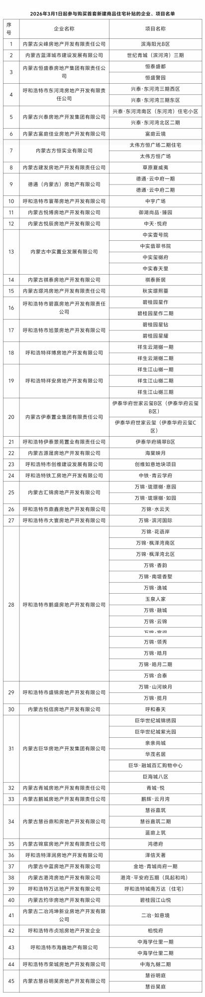 本網(wǎng)訊(草原云·正北方網(wǎng)記者 鄭慧英) 記者從呼和浩特市住建局了解到,根據(jù)《呼和浩特市住房和城鄉(xiāng)建設(shè)局 呼和浩特市財(cái)政局關(guān)于<呼和浩特市人民政府關(guān)于促進(jìn)人口集聚 推動(dòng)人口高質(zhì)量發(fā)展的實(shí)施意見>中購買首套新建商品住宅補(bǔ)貼相關(guān)事宜的通知》(呼住建聯(lián)發(fā)〔2026〕11號)文件要求,從2026年3月1日起購買首套新建商品住宅補(bǔ)貼政策調(diào)整為:“房地產(chǎn)開發(fā)企業(yè)自愿參加購房補(bǔ)貼政策的,向市住建局申請”,經(jīng)匯總,2026年3月1日起有45家房地產(chǎn)開發(fā)企業(yè)、83個(gè)項(xiàng)目參與補(bǔ)貼,購房人購買不在名單內(nèi)的項(xiàng)目不享受購買首套新建商品住宅補(bǔ)貼政策。具體名單公布如下: